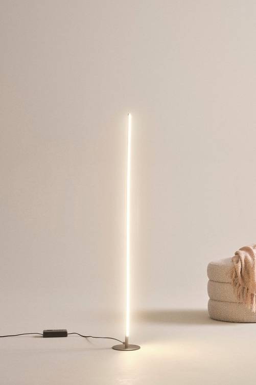 Lyxig minimalistisk golvlampa i krom med LED ljus. 1,8 m sladd med dimmer. Material: Metall. Storlek: Höjd 125 cm djup 15 cm. Sockel/lampa: LED max 12 w. Tips/Råd: Ett rum ska ha 5-8 ljuskällor för att få ett jämt ljus i rummet.