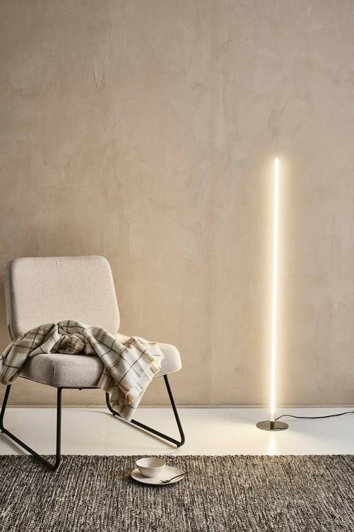 Lyxig minimalistisk golvlampa i krom med LED ljus. 1,8 m sladd med dimmer. Material: Metall. Storlek: Höjd 125 cm djup 15 cm. Sockel/lampa: LED max 12 w. Tips/Råd: Ett rum ska ha 5-8 ljuskällor för att få ett jämt ljus i rummet.