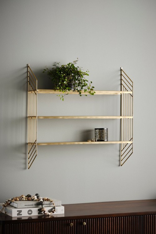 Vägghylla av pulverlackad metall med retrokänsla. Hål för upphängning. Maxbelastning 15 kg. Material: Metall. Storlek: Höjd 61 cm, bredd 61 cm, djup 15 cm. Skötselråd: Torkas av med lätt fuktad trasa.
