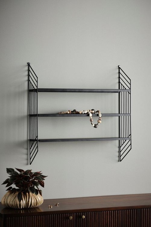 Vägghylla av pulverlackad metall med retrokänsla. Hål för upphängning. Maxbelastning 15 kg. Material: Metall. Storlek: Höjd 61 cm, bredd 61 cm, djup 15 cm. Skötselråd: Torkas av med lätt fuktad trasa.