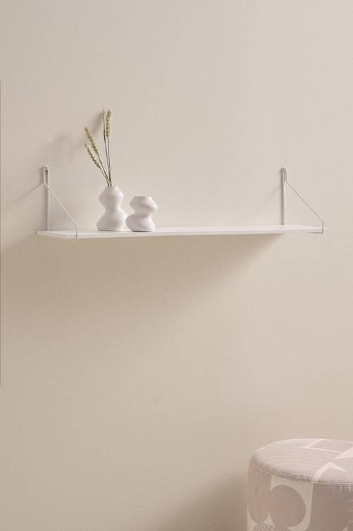 Vägghylla av pulverlackad melamin med hål för upphängning. En praktisk och stilren hylla som passar in i de flesta hem och stilar. Viss montering krävs. Monteringsanvisning medföljer. Material: Melamin. Storlek: Höjd 18 cm, bredd 79 cm, djup 18 cm. Skötselråd: Torkas av med lätt fuktad trasa.