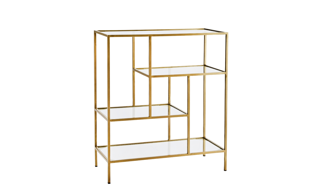 Wynn är en kvadratisk golvhylla med olika nivåskillnader som ger ett spännande intryck med plats för massa vackra dekorationer. Hyllan kommer från Madam Stoltz och har fyra olika hyllplan i klarglas med järnram i mässingfinish.En stilsäker möbel som passar i de flesta hem och stilar.